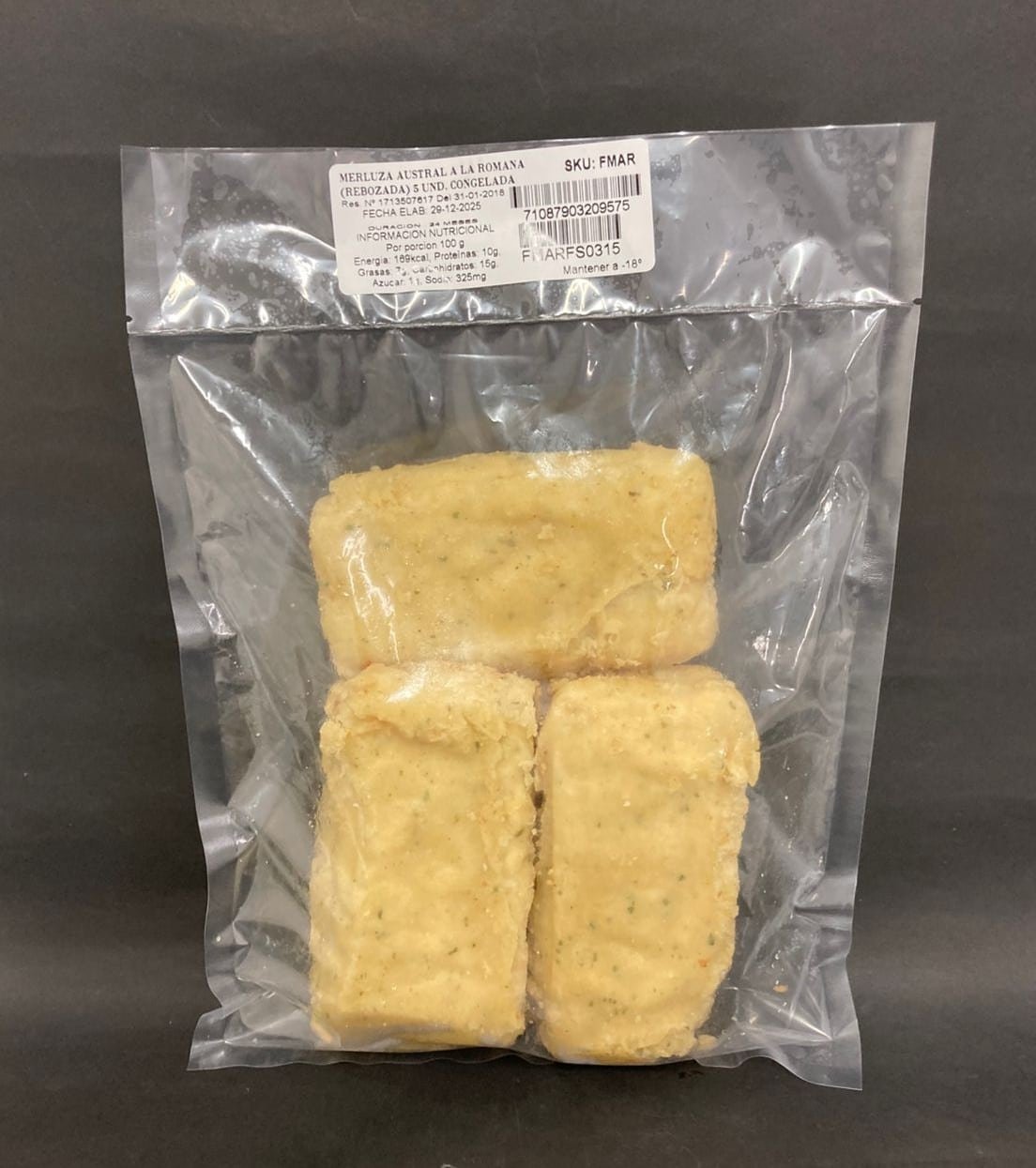 Ingredientes: pulpa de merluza austral, agua, harina de trigo, mezcla aceite vegetal (aceite de maravilla, aceite de soya), harina de maíz, almidón de maíz, grasa de palma en polvo, azúcar, sal, goma guar, pirofosfato ácido de sodio, carbonato de sodio, proteína de leche, perejil, cebolla en polvo, nuez moscada, pimienta, colorante natural (extracto de bija).